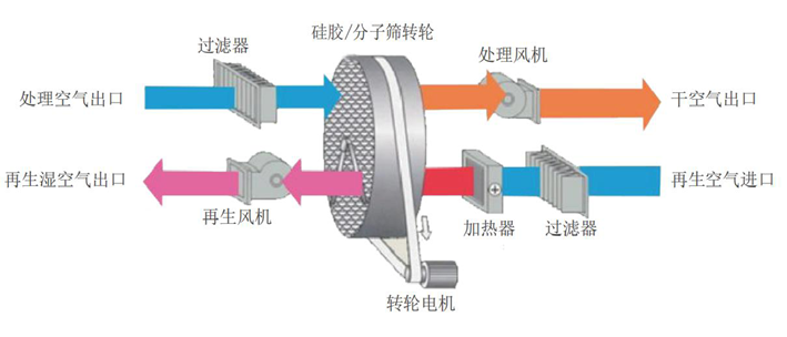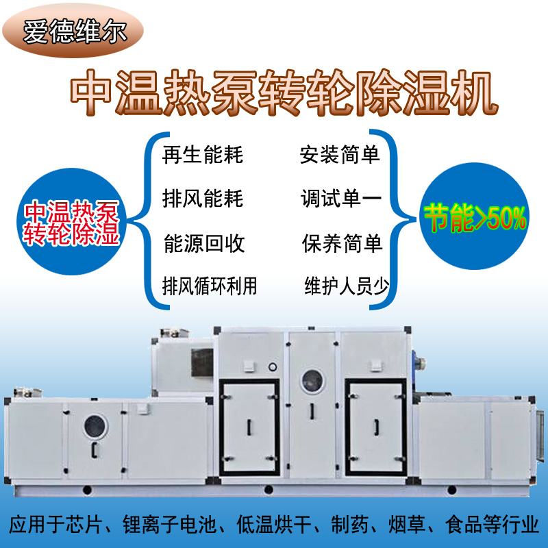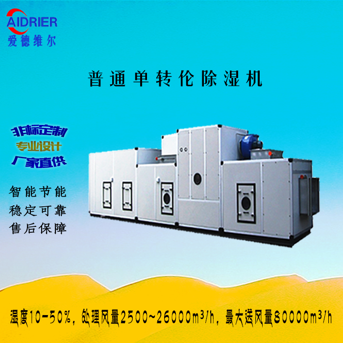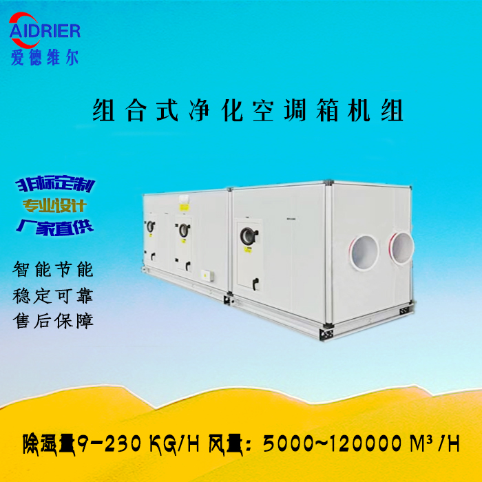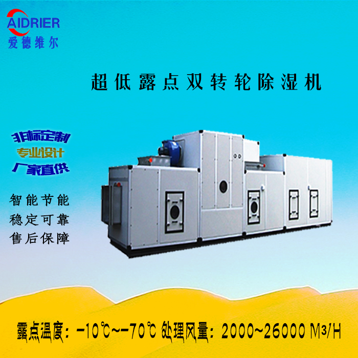 采用保温箱体结构的中大型组合式双转轮吸附技术的除湿机,采用高温再生技术。转轮为高温转轮,机组内部自带废热回收系统,只需外界提供部分再生热源. 吸附式转轮除湿风量从1 4 0 0 ~ 2 7 0 0 0 m³/ h ; 机组最大送风量可达27000m³/h;主要应用于锂电新能源行业,制药行业等行业,其应用领域为超低湿度环境要求(露点在-20℃以下)