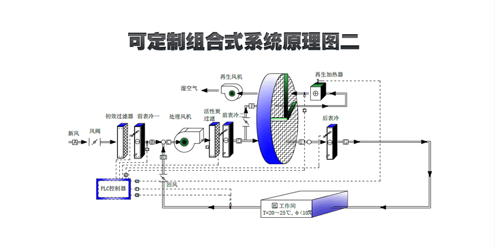 组合式单转轮除湿机主要组成单元:高效硅胶转轮、再生脱附风机、处理吸附风机、表冷器、控温加热器、加湿器、再生加热器(电加热、蒸汽加热盘管、热水盘管、热泵等加热装置)、转轮驱动单元、过滤器、风阀、保温密封箱体、密封附件、电气系统等。