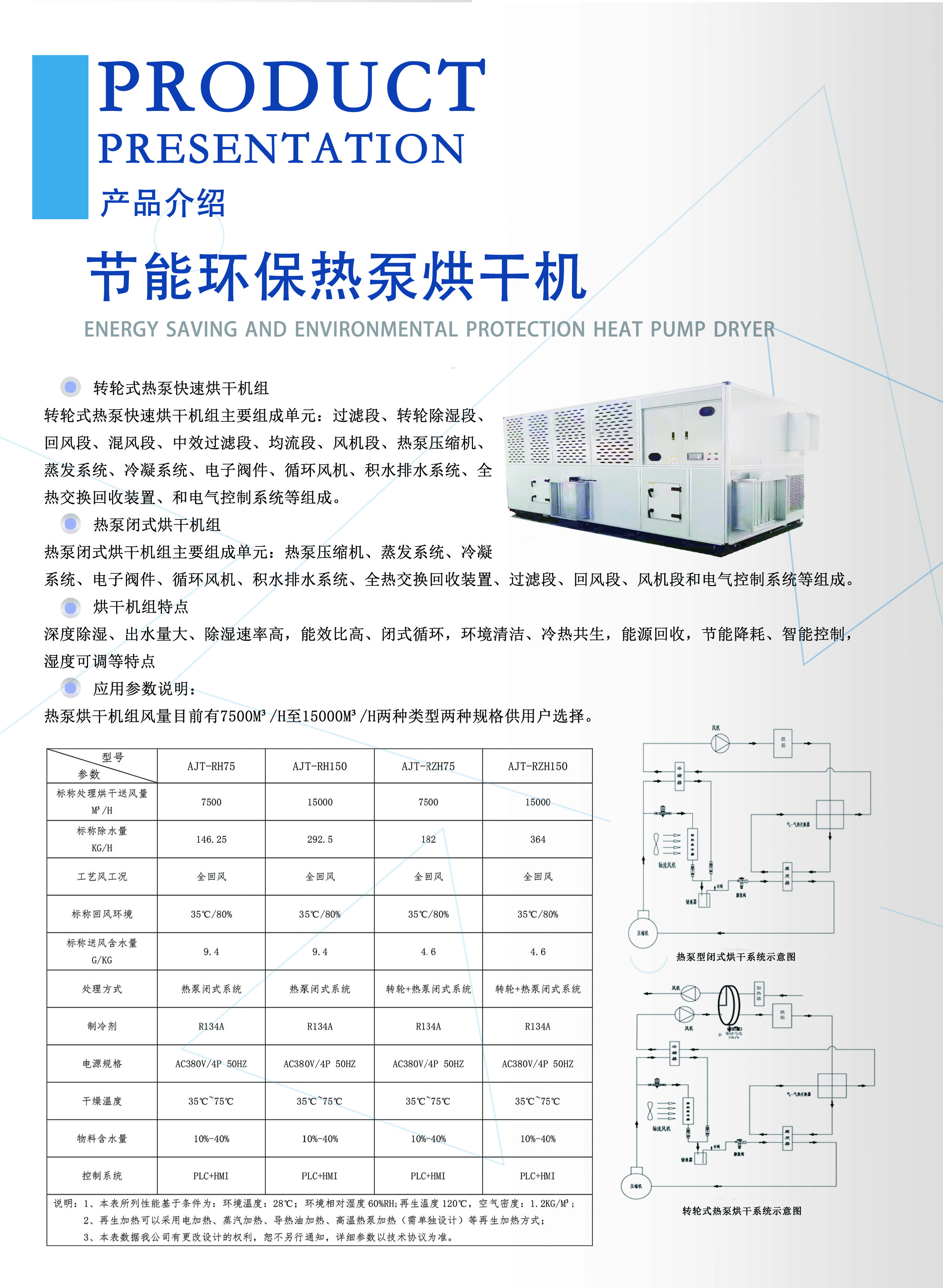 深度除湿、出水量大、除湿速率高,能效比高、闭式循环,环境清洁、冷热共生,能源回收,节能降耗、智能控制,湿度可调等特点,热泵烘干机组风量目前有7500m³/h至15000m³/h两种类型两种规格供用户选择。